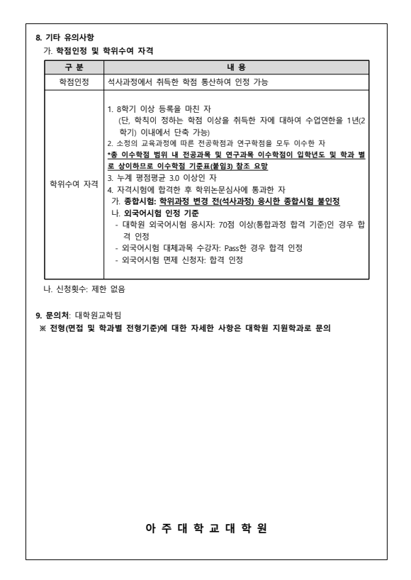 지원서 접수 | 2025.11.25.(화) 09:00 ~ 2025.12.04.(목) 17:00 | - 제출서류 ① 학위과정변경 신청서 ② 성적증명서 - 제출처: 대학원교학팀(율곡관 305호) |