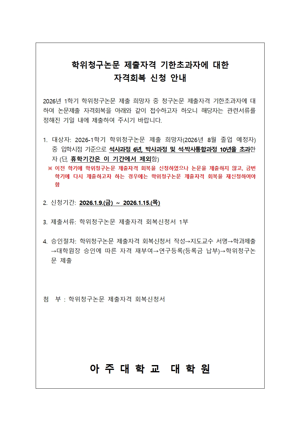 [공지] [~01.15.] 학위청구논문 제출자격 기한초과자 자격회복 신청 안내 (2026학년도 1학기)