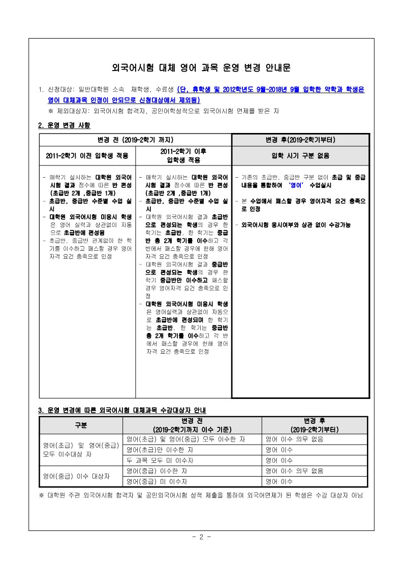 • 학생 및 2012학년도 9월 ~ 2018학년도 9월 입학한 약학과 학생은 영어 대체과목 인정이 되지 않으므로 신청대상에서 제외)