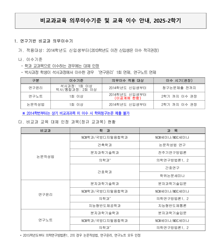 2) 박사, 석박사통합과정의 경우 연구윤리를 2회 이수해야 함