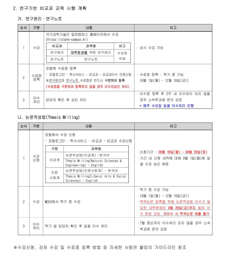 「대학원연구입문」수업 안에 비교과 교육이 포함됨
