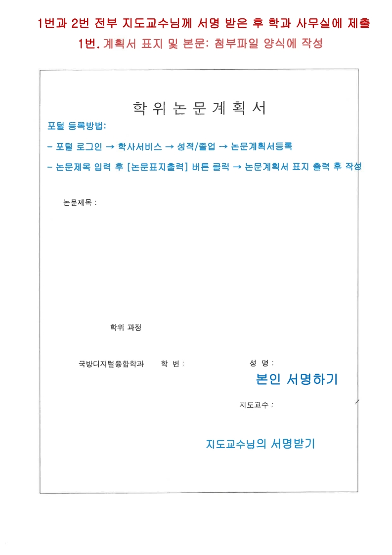| 1 | 계획서 표지 | • 포털에 등록하여 출력한 것 • 포털 로그인 → 학사서비스 → 성적/졸업 → 논문계획서등록 • 논문제목 입력 후 [논문표지출력] 버튼 클릭 → 논문계획서 표지 출력 후 작성 |
