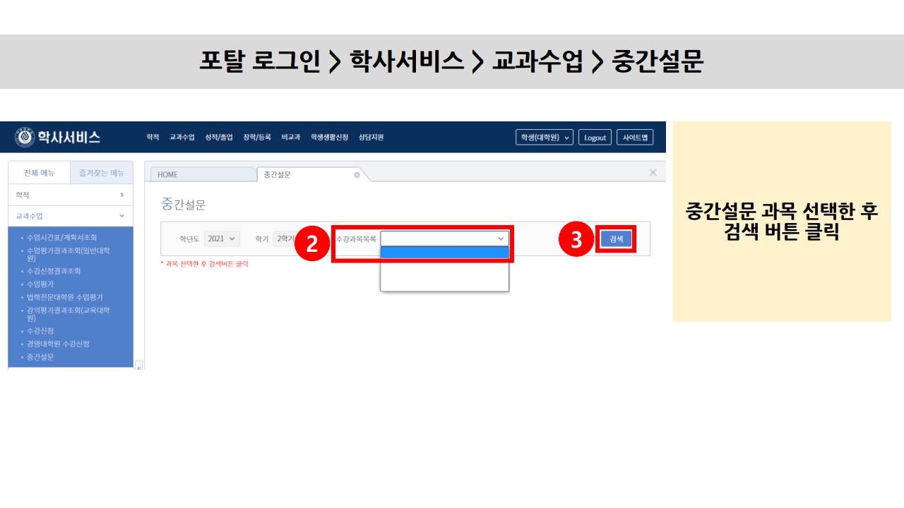 • 포탈 로그인 → 학사서비스 → 교과수업 → 중간설문