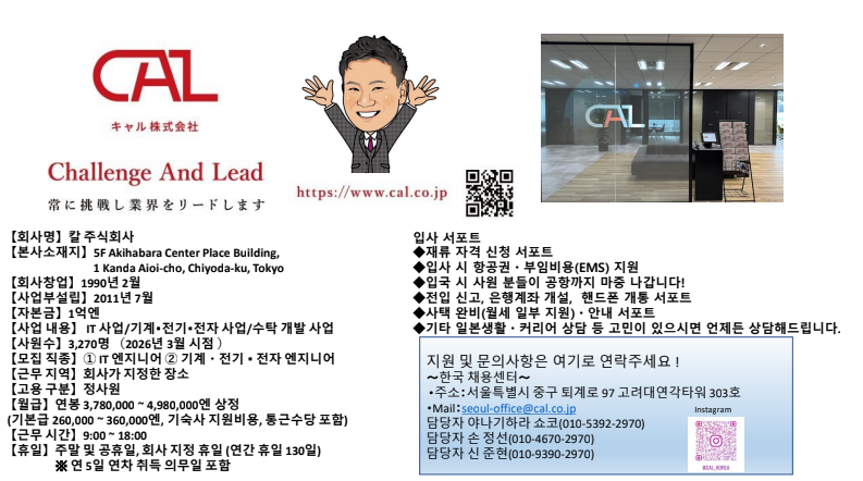아래와 같이 일본기업(CAL)의 채용정보를 공유드리니,