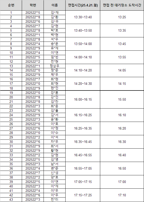 - 장소 : 혜강관 103호 (혜강관 1층 대기 후, 호명 시 면접장 입장)