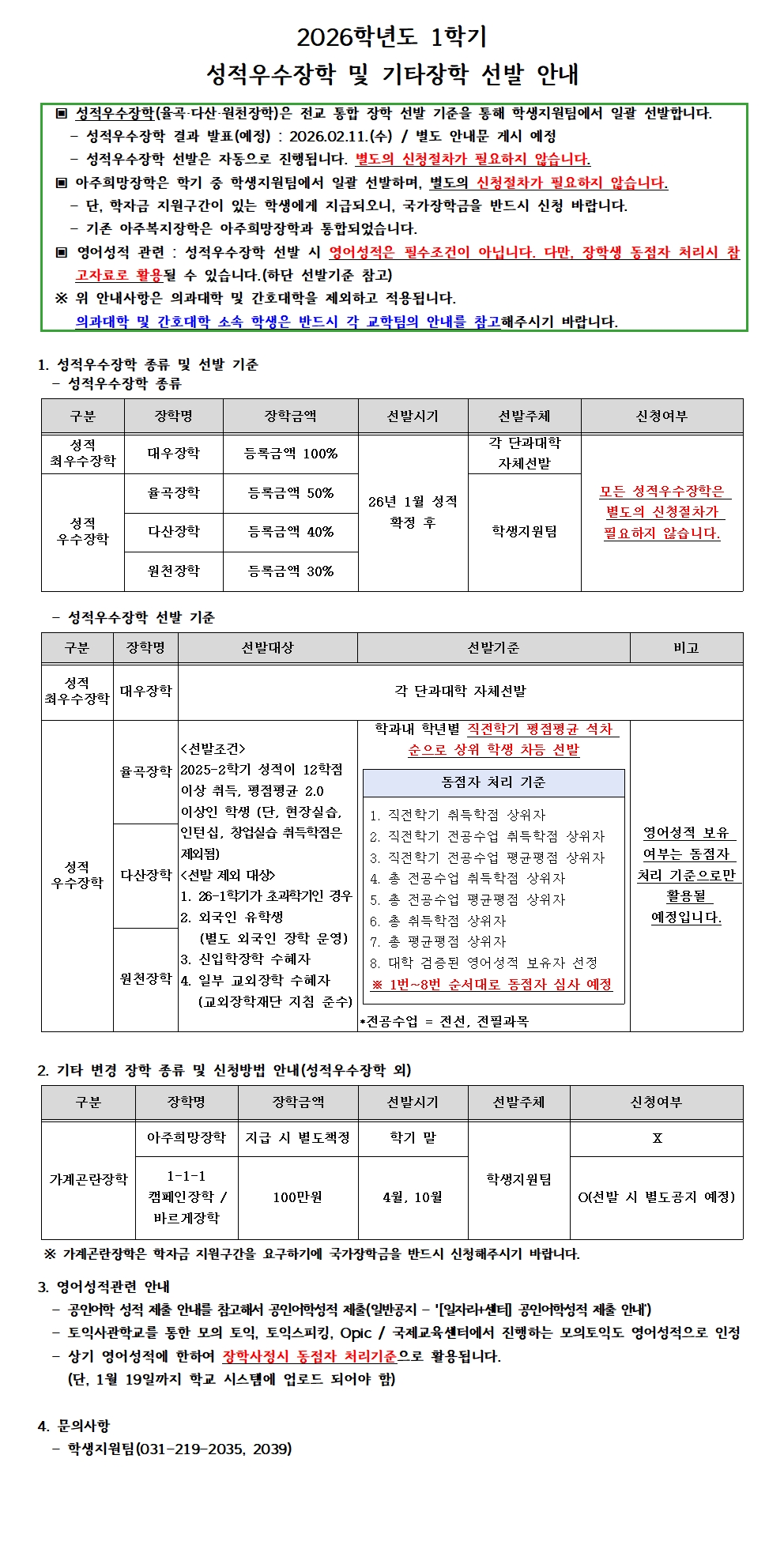 [공지] [장학] 2026학년도 1학기 성적우수장학 및 기타장학 선발 안내