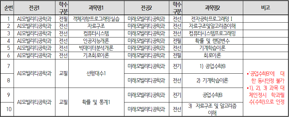 나. 적용 시기: 2025-1학기부터 적용 다. 적용 대상: 미래모빌리티공학과 23, 24학번 재학생, 25학번 이전 전입생 및 부·복수생 라. 비고: AI모빌리티공학과 “(교필) 프로그래밍기초”와 미래모빌리티공학과 “(교필) 융합프로그래밍”의 동일과목 지정 논의중(26.01.22) ※동일과목 재수강 수강신청시 주의사항(재수강: C+ 이하 학생만 가능) 1) 기존 AI모빌리티공학과 과목명과 동일한 과목명으로 미래모빌리티공학과 과목 수강신청시 전산상 자동적으로 재수강 처리됨 2) 동일과목 명단 내 과목 중 타 학과에서 개설되는 과목을 수강신청할 경우, 반드시 수강신청 완료이후 미래모빌리티공학과 교학팀 메일(mimo@ajou.ac.kr)을 통해 연락해야 함. (타 학과에서 개설한 과목을 수강신청시 교학팀에 연락을 통해서만 재수강 처리가 가능하며, 전산상 오류가 발생하지 않음.) |