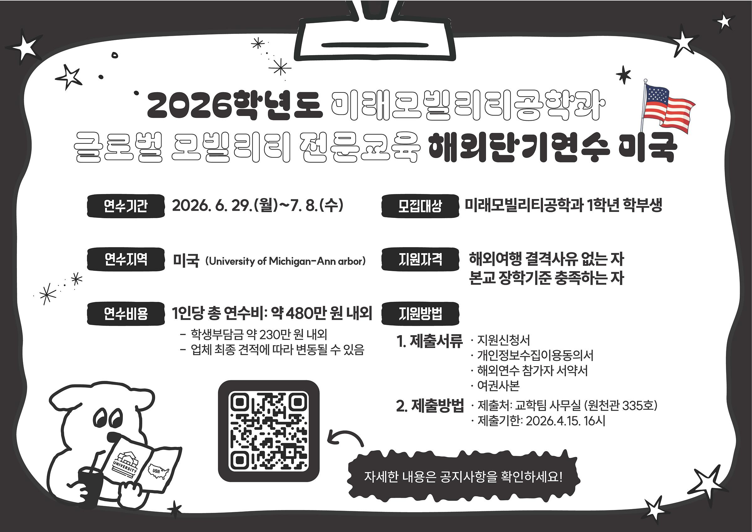 [공지] 2026학년도 글로벌 모빌리티 전문교육 해외 단기연수(미국) 모집 안내(-4/15)