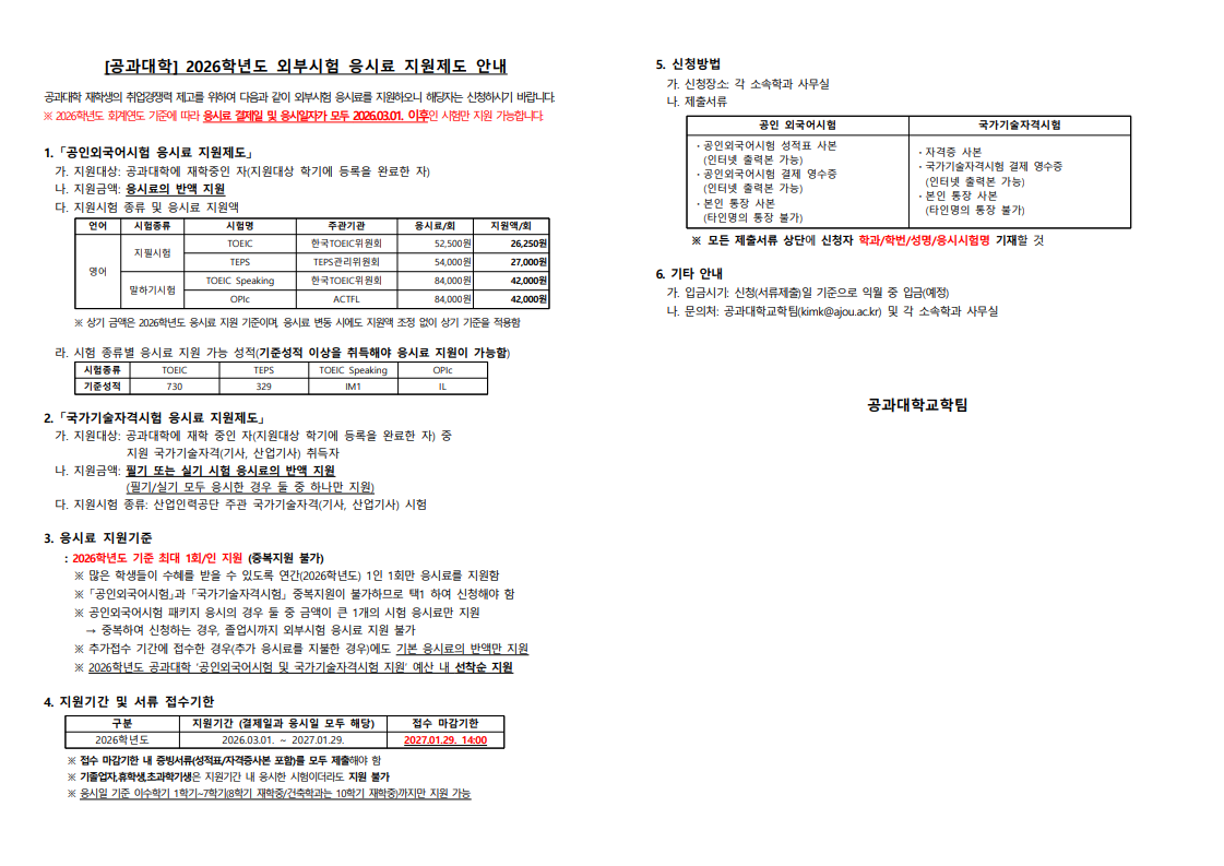 [공과대학] 2026학년도 외부시험 응시료 지원제도 안내
