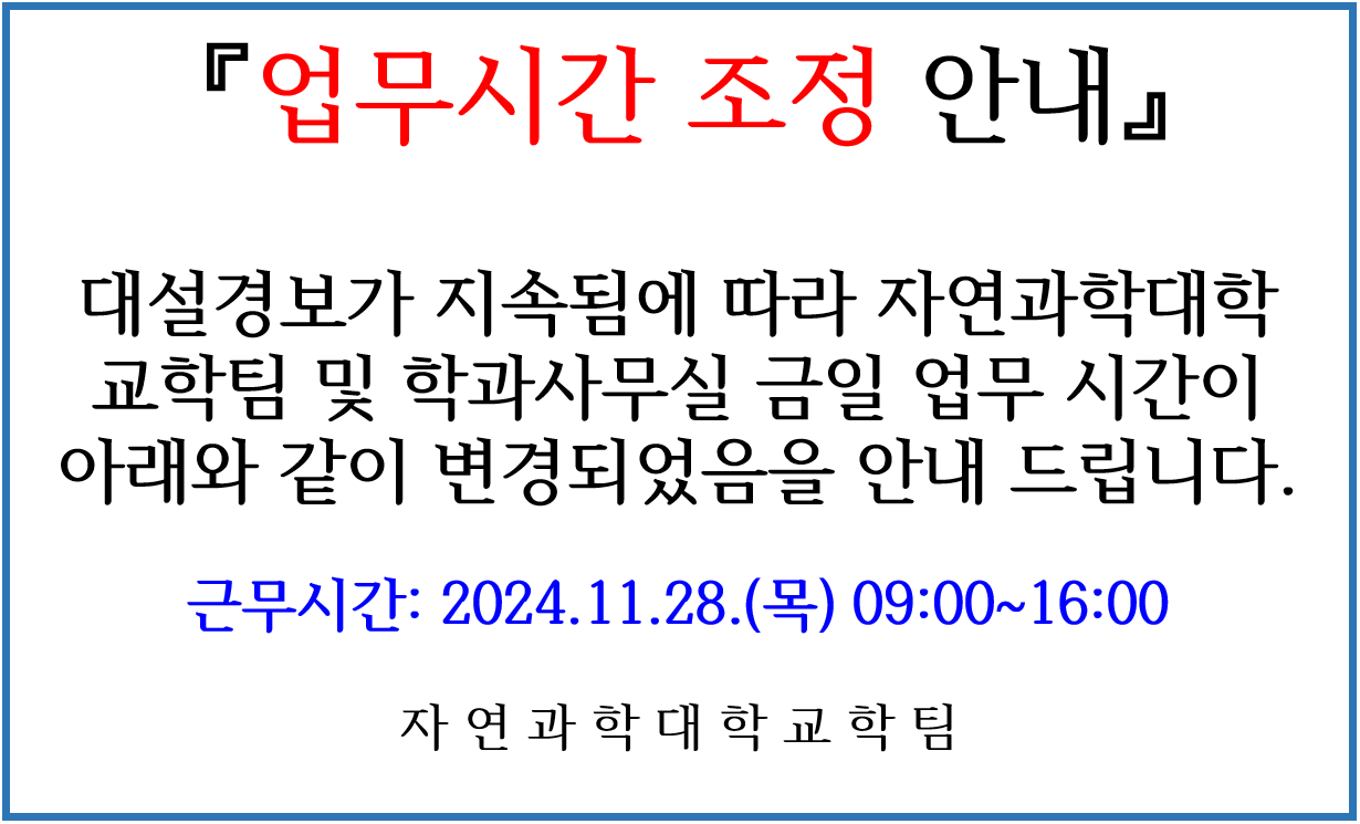 [기타] [자연대교학팀] 11.28(목) 대설경보로 인한 교학팀 및 학과사무실 업무시간 조정 안내
