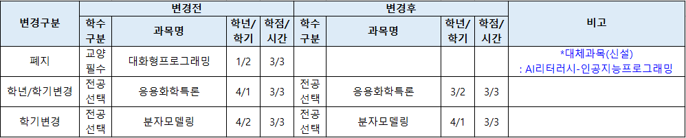 ※ 교육과정 변경사항과는 별개로 교과목 이수 시 본인 학번의 요람 기준으로 학수구분이 적용되오니, 반드시 본인