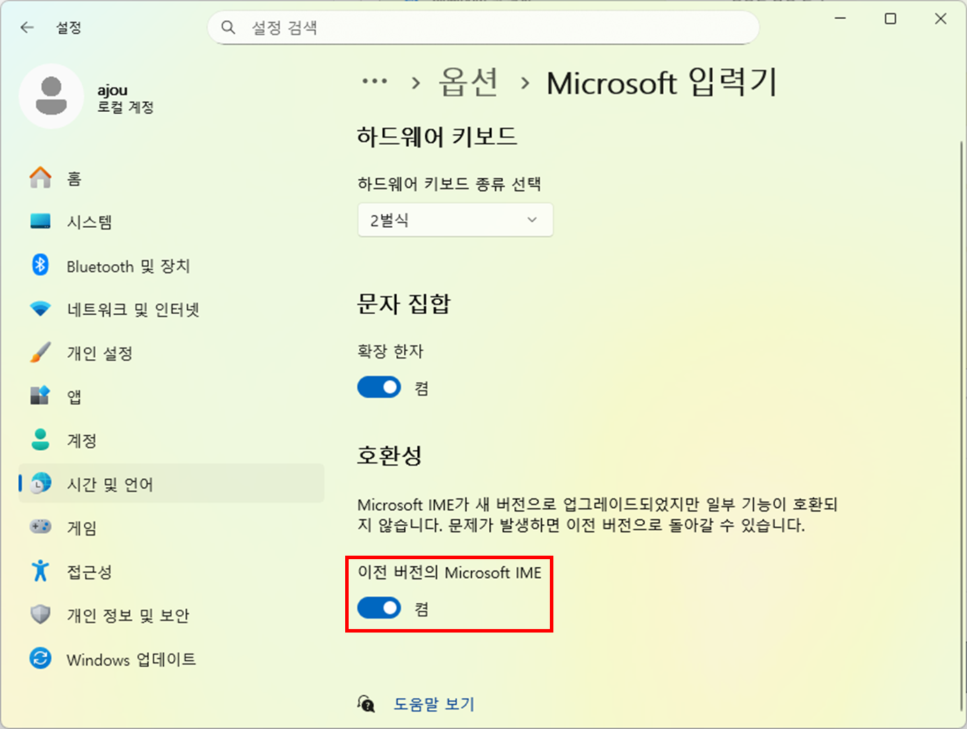 3. 이전 버전의 Microsoft IME '켬' 설정