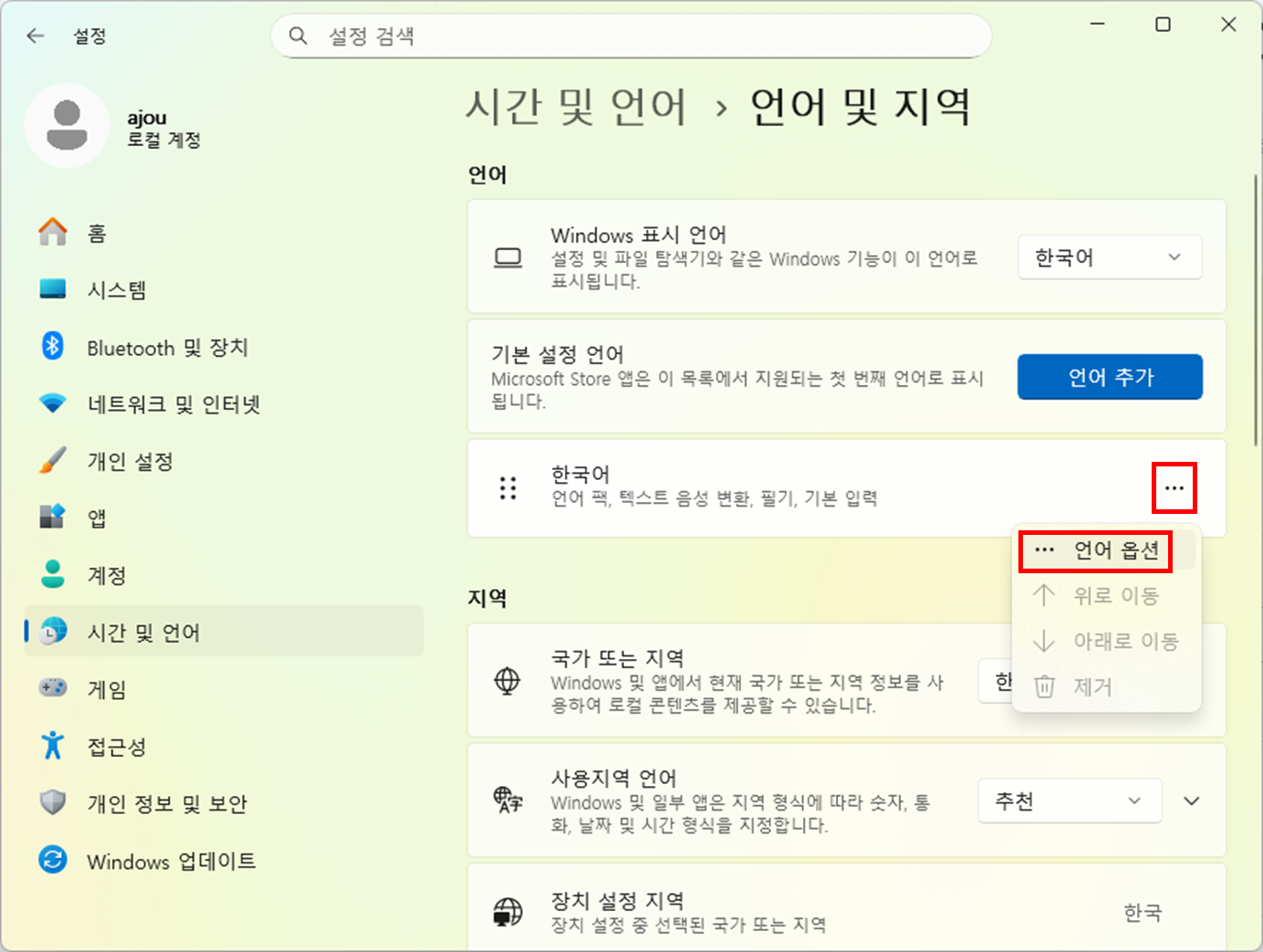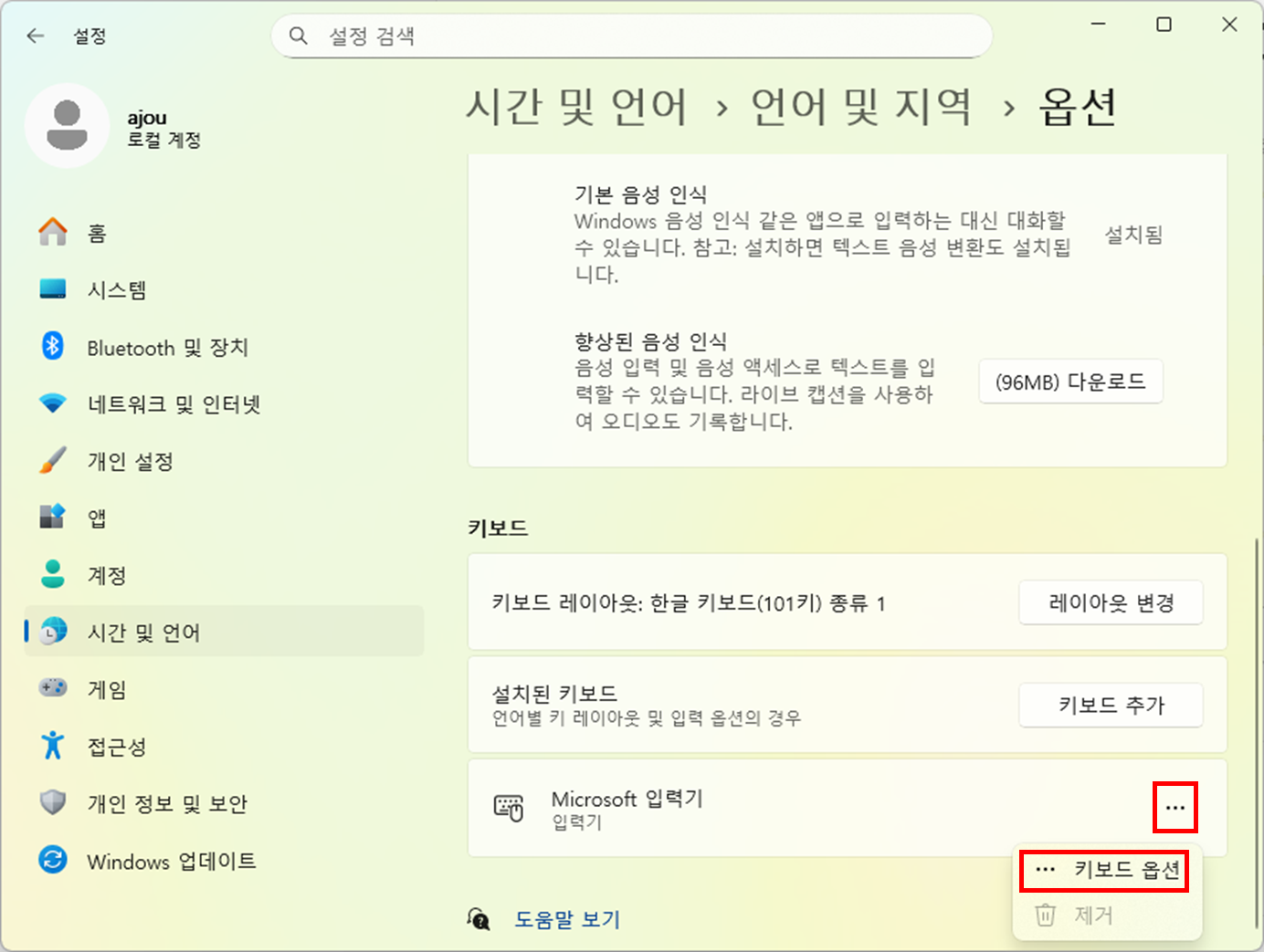 1. 시작(윈도우키) → 설정 → 시간 및 언어 → 언어 및 지역 → 한국어 [...] → [언어 옵션]