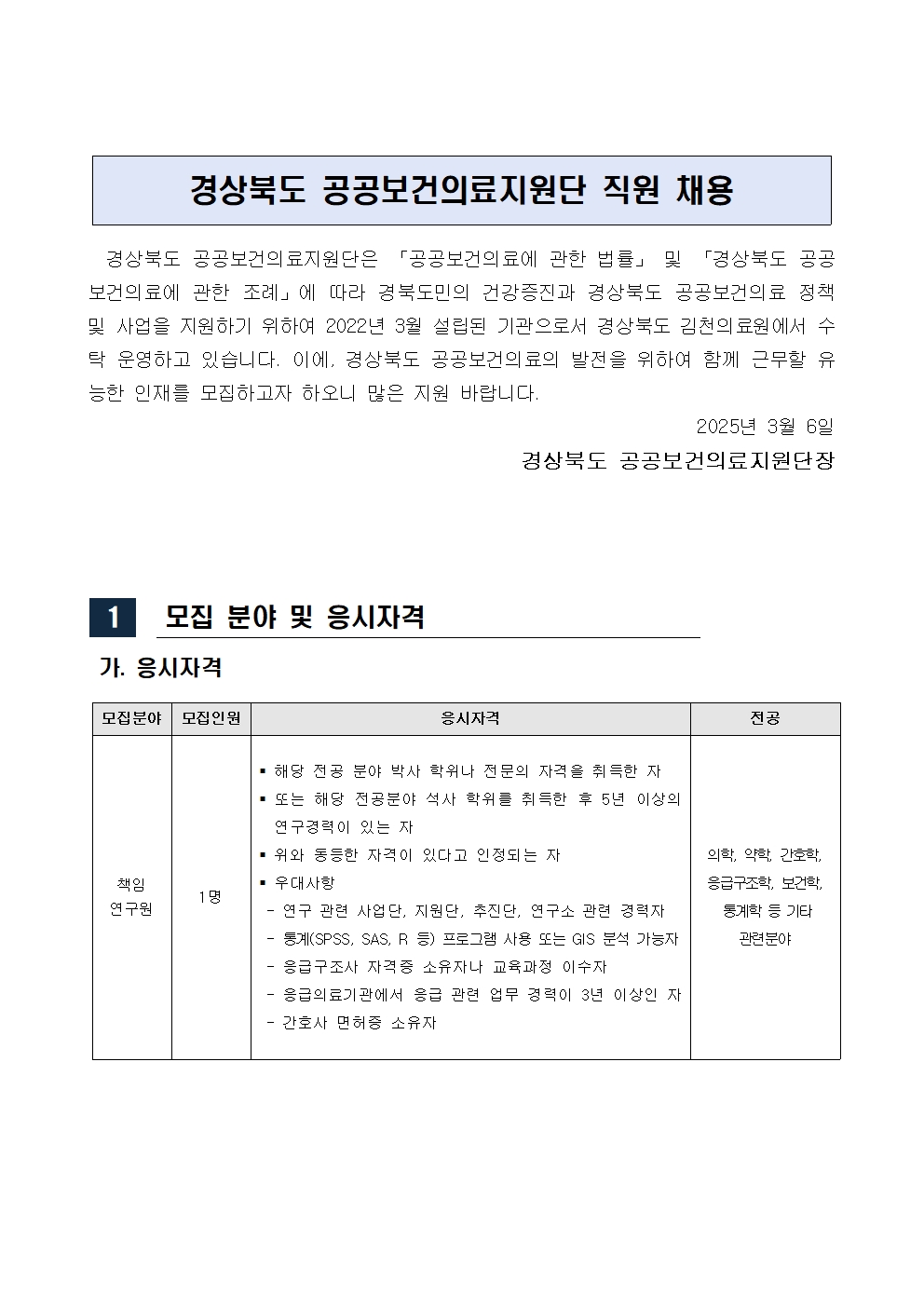 [취업] 경상북도 공공보건의료지원단 직원채용 공고