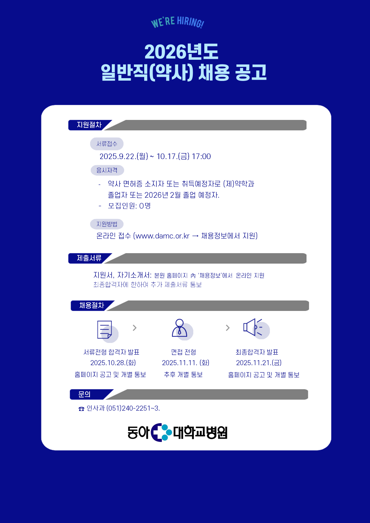 [취업] [동아대병원] 2026년도 동아대학교병원 약사 채용 공고