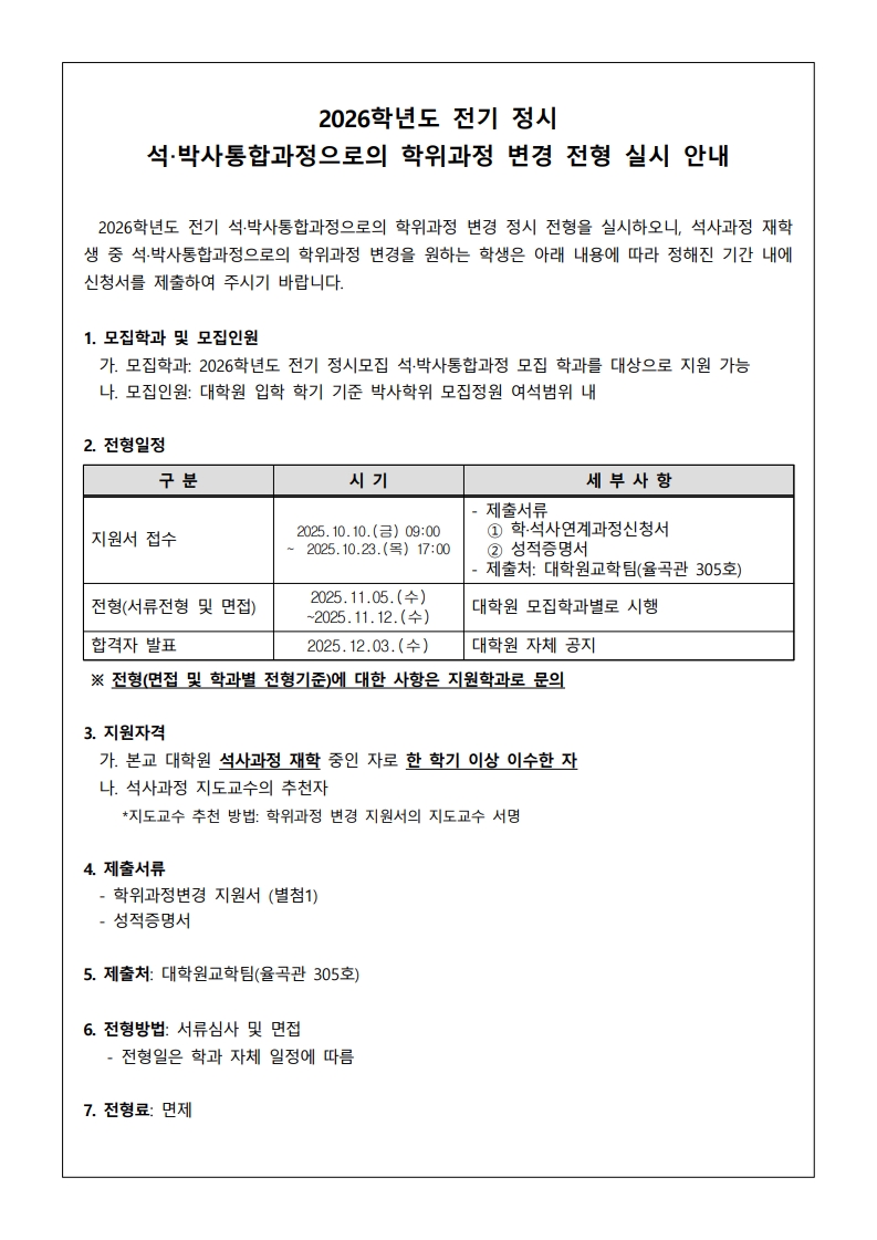 - 붙임1. 2026 전기 정시 석박사통합 학위과정변경 모집전형 안내문.pdf
