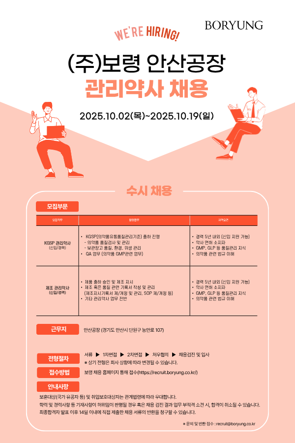 [(주)보령] 안산공장 관리약사 채용