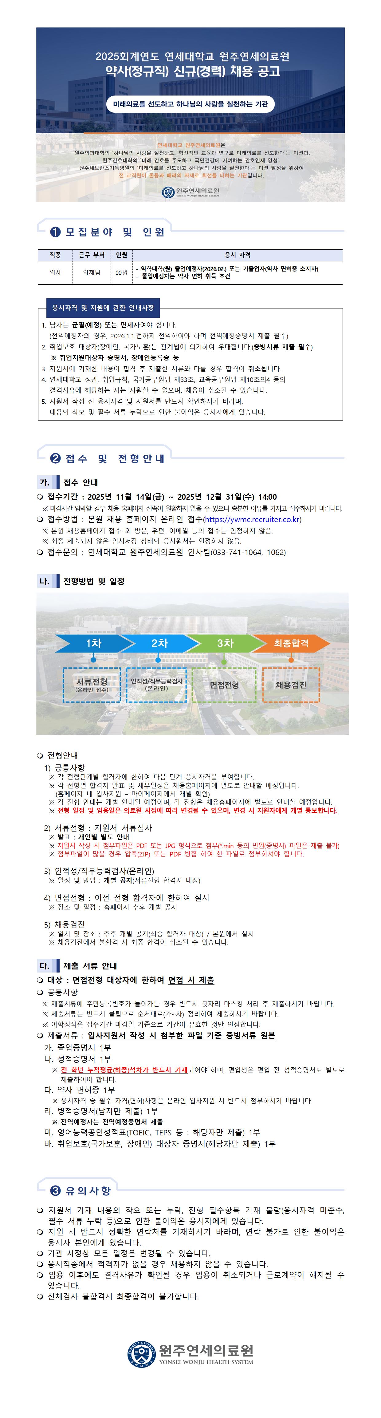 [취업] 연세대학교 원주연세의료원 약사(정규직) 신규(경력) 채용 공고