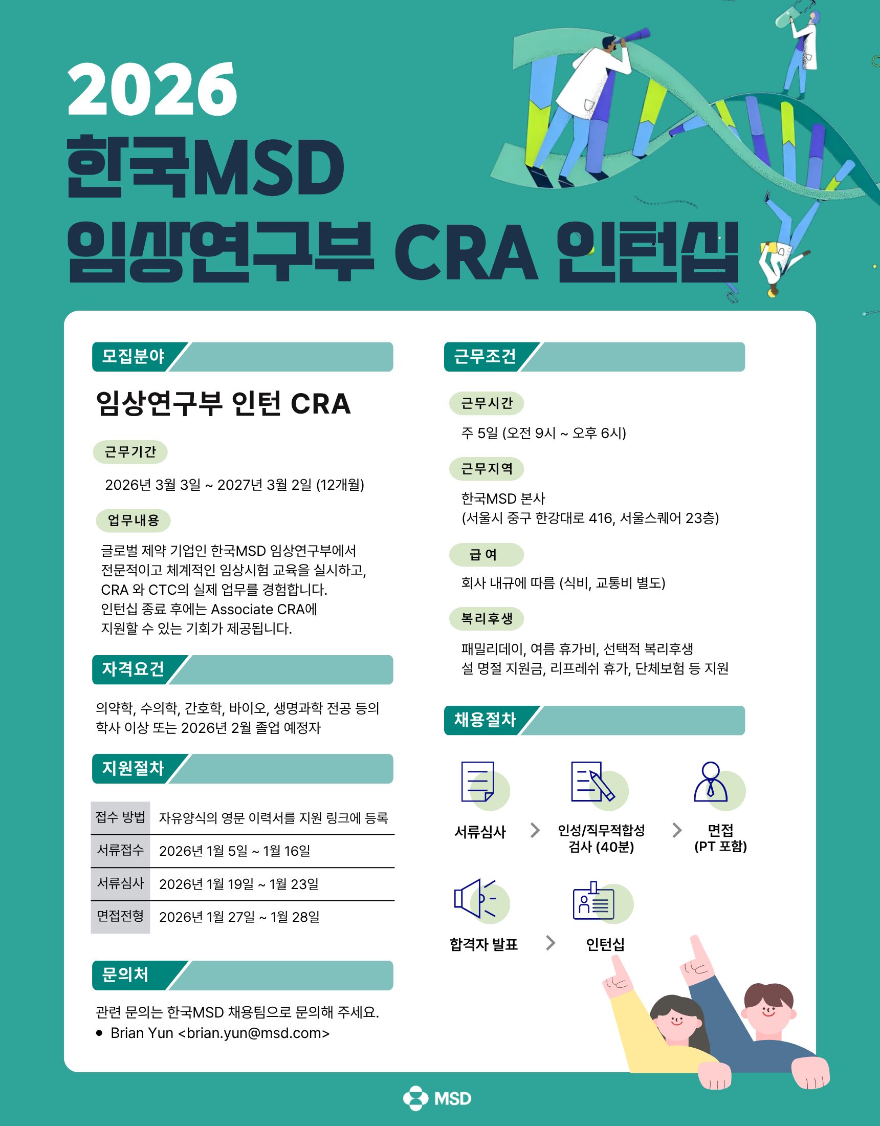 한국MSD임상연구부서(GCTO)에서2026년도 임상연구부CRA인턴십 포지션을 채용중입니다.
