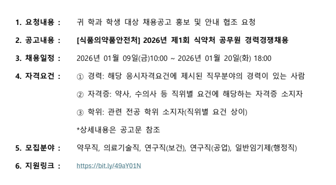 [취업] [식품의약품안전처] 2026년 제1회 공무원 경력경쟁채용시험 공고