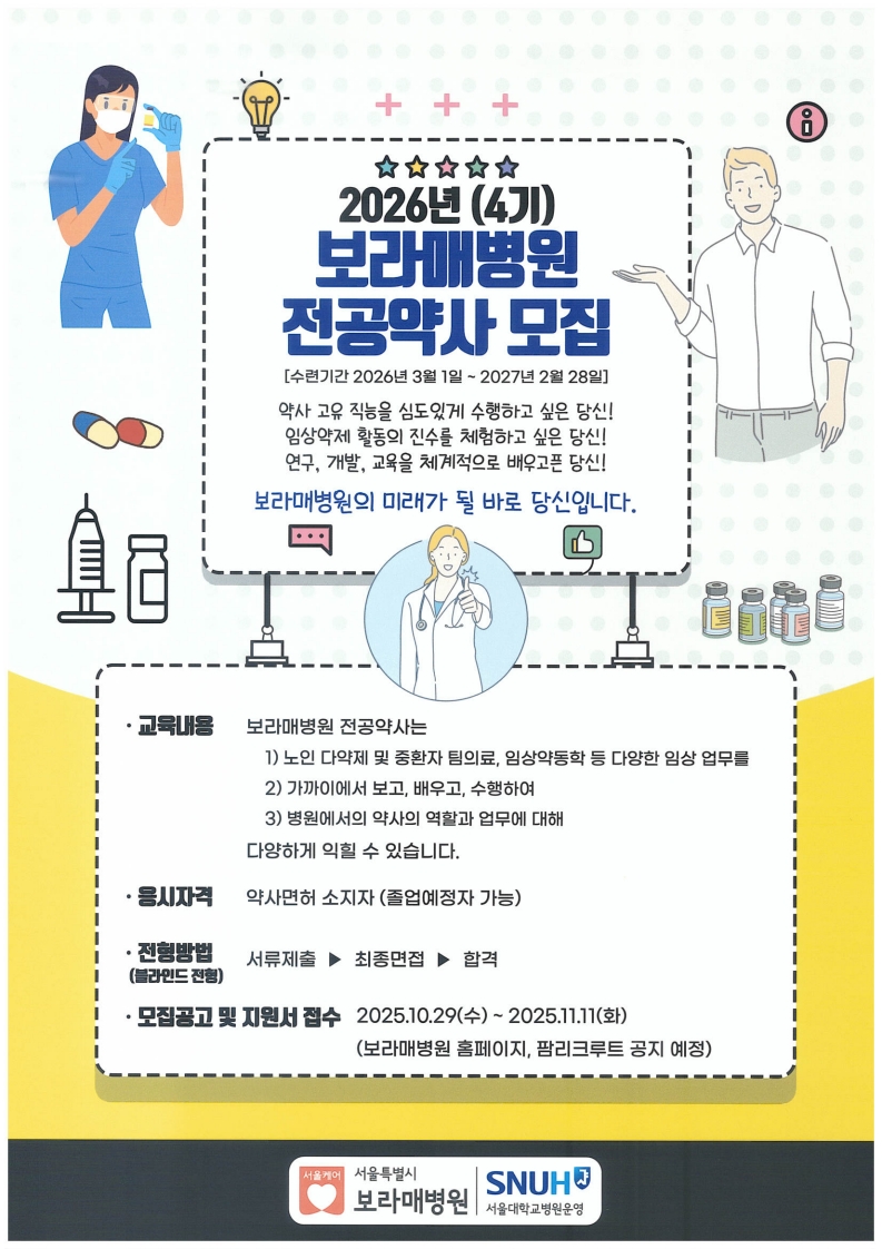 [취업] [보라매병원 약제부] 2026년도 전공약사(레지던트) 모집 알림