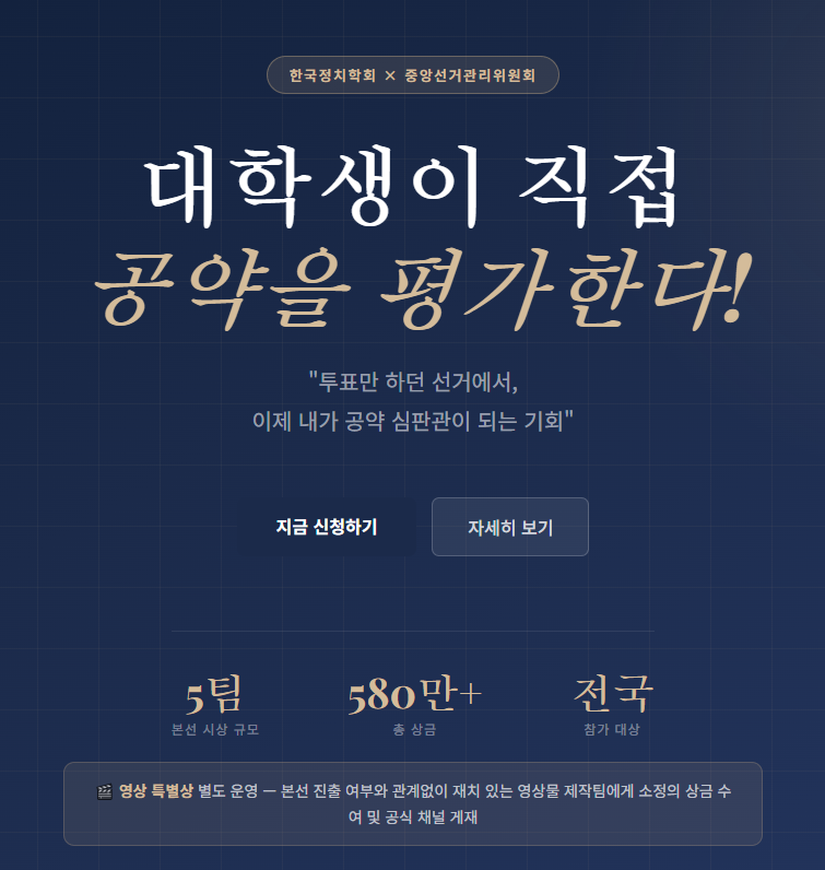 한국정치학회와 중앙선거관리위원회는 제9회 전국동시지방선거를 앞두고 정책선거 분위기 조성을 위해 대학생 정책선거 콘서트를 개최·후원합니다. 본 행사는 대학생들이 지방자치단체장의 공약을 대상으로 이행 여부를 넘어 정책 성과까지 평가할 수 있는 분석틀을 직접 설계하고 제안하는 경진대회입니다. 관심있는 대학생 여러분의 많은 참여를 바랍니다.