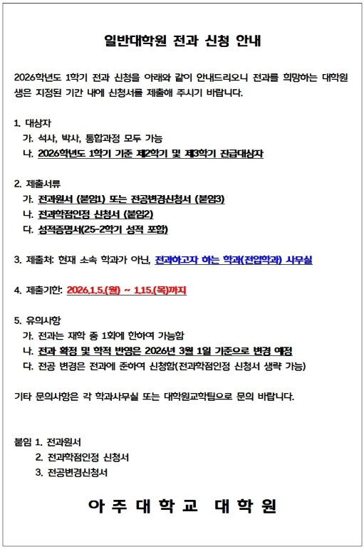 [학사] 2026-1학기 전과(전공변경) 신청 안내