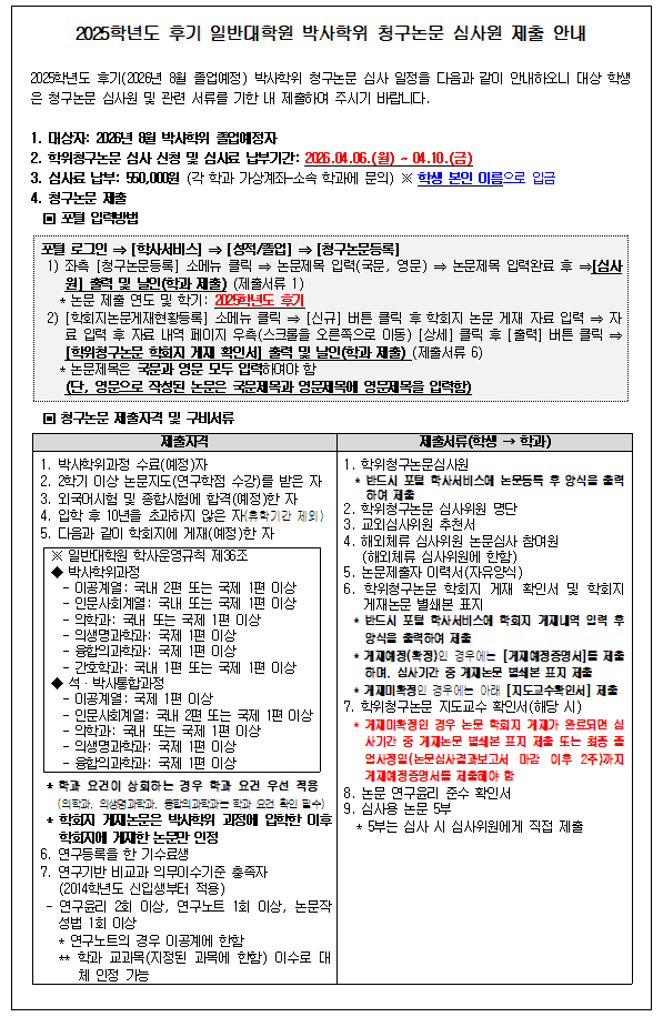[학사] 2025학년도 후기(2026년 8월 졸업예정) 박사학위 청구논문 심사원 제출 안내