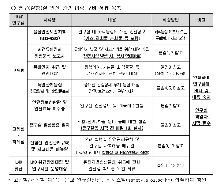 [기타] [안전관리센터]연구(실험)실 안전 관련 법적 구비 서류 안내