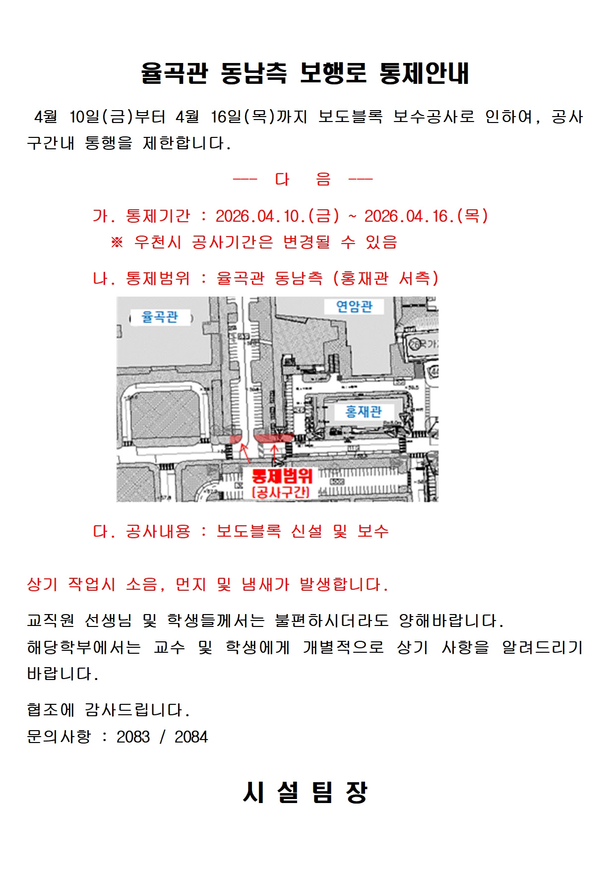율곡관 동남측 보행로 통제안내