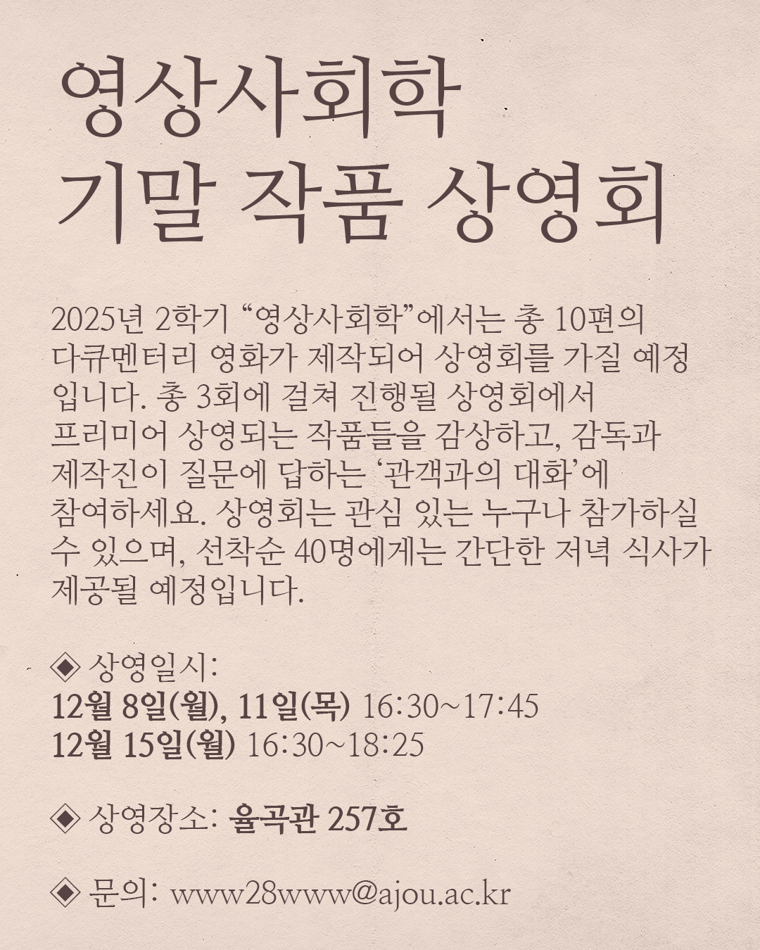 2025년 2학기 “영상사회학”에서는 총 10편의 다큐멘터리 영화가 제작되어 상영회를 가질 예정입니다. 총 3회에 걸쳐 진행될 상영회에서 프리미어 상영되는 작품들을 감상하고, 감독과 제작진이 질문에 답하는 ‘관객과의 대화’에 참여하세요.
