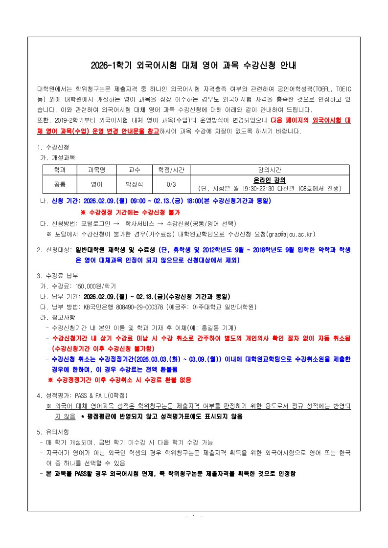 2026-1학기 외국어시험 대체 영어 과목 수강신청 안내