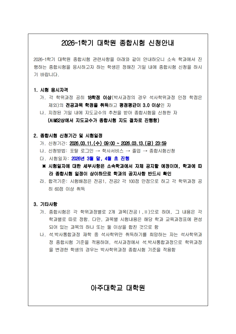 [공지] 2026-1학기 대학원 종합시험 신청 안내 (3/11~3/13)