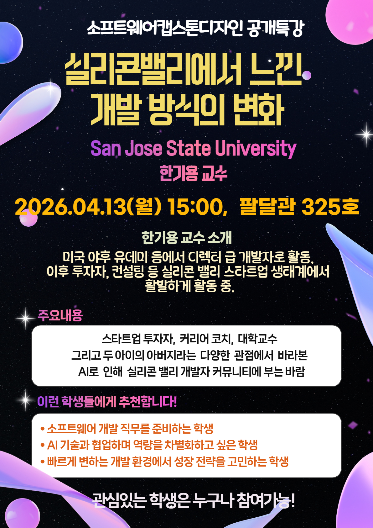 [기타] 소프트웨어캡스톤디자인 공개특강 04.13(월) '실리콘밸리에서 느낀 개발방식의 변화' (한기용 San Jose State University 교수) 참여 안내