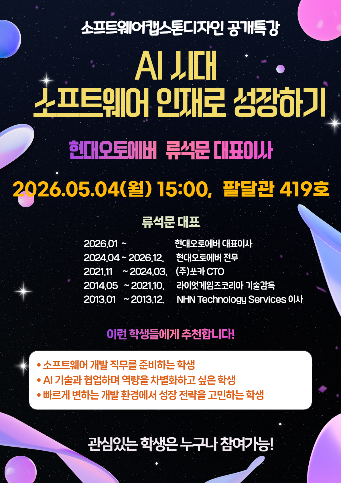 [기타] 소프트웨어캡스톤디자인 공개특강 05.04(월) 'AI시대 소프트웨어 인재로 성장하기' (류석문 현대오토에버 대표) 참여 안내