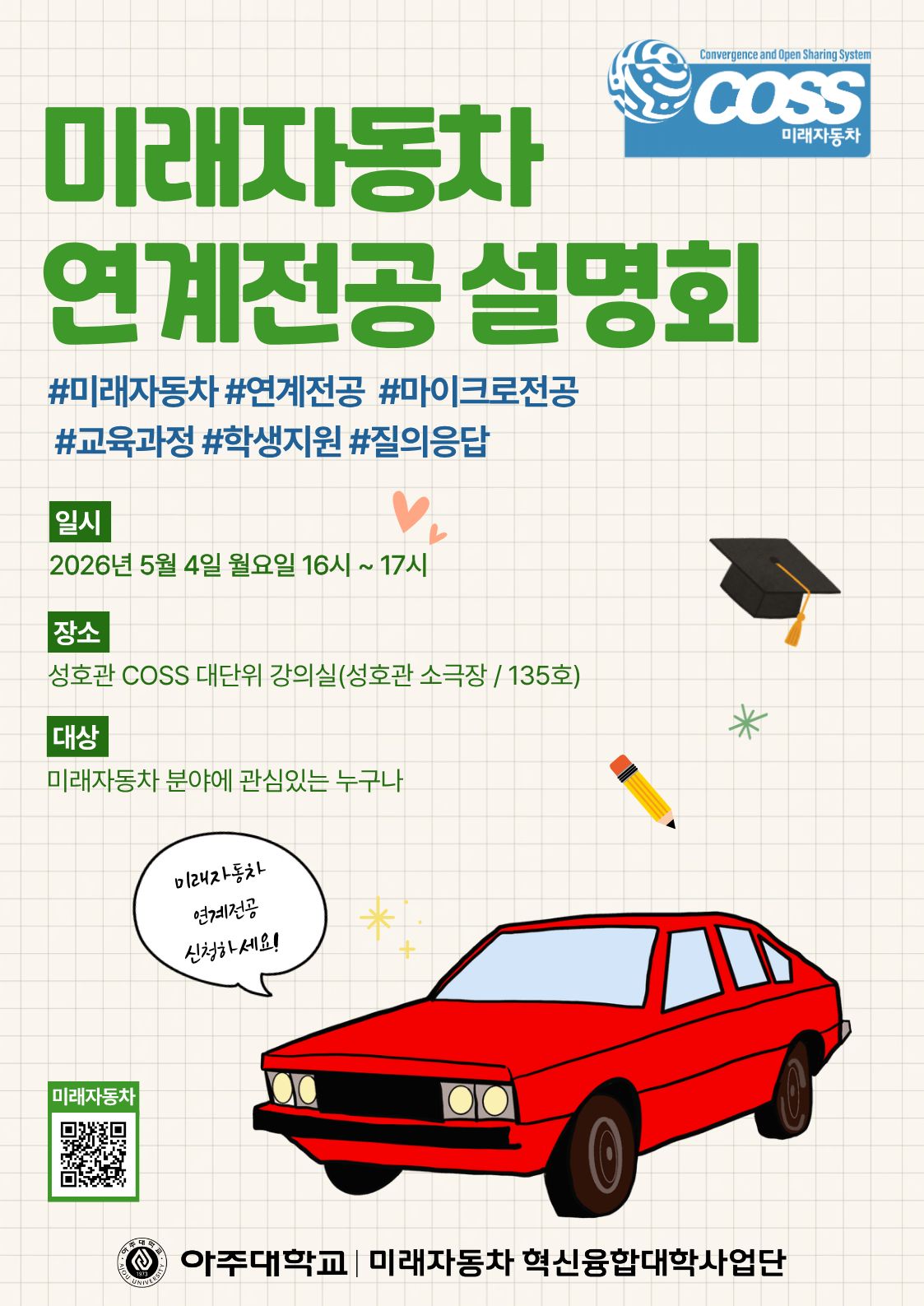 미래자동차에 관심 있는 아주대 재학생이라면 누구나 참석할 수 있으니 전공설명회에 참석하여 미래자동차 전공에 대한 정보를 얻어가세요!
