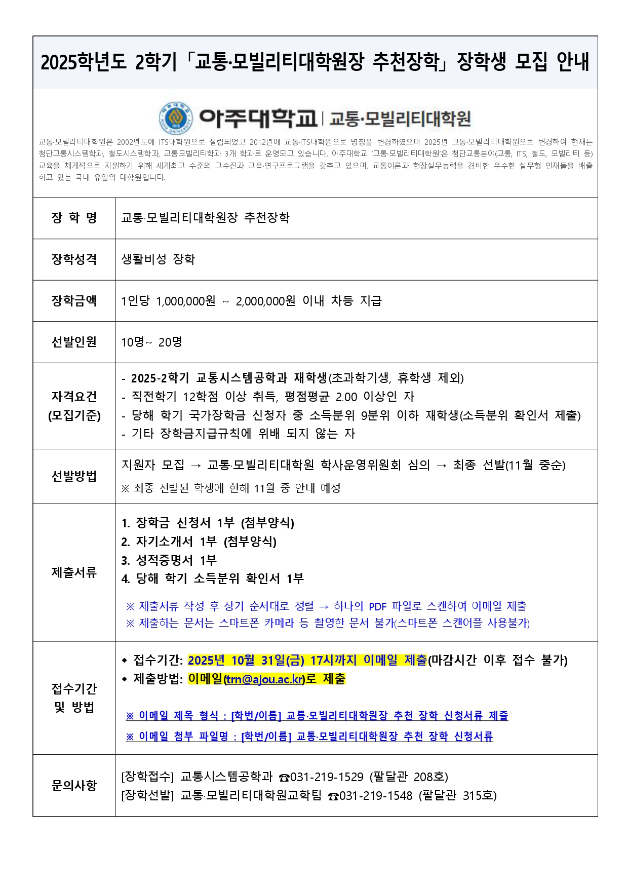 [공지] 「교통·모빌리티대학원장 추천장학」장학생 모집 안내(~10/31(금) 17시까지)