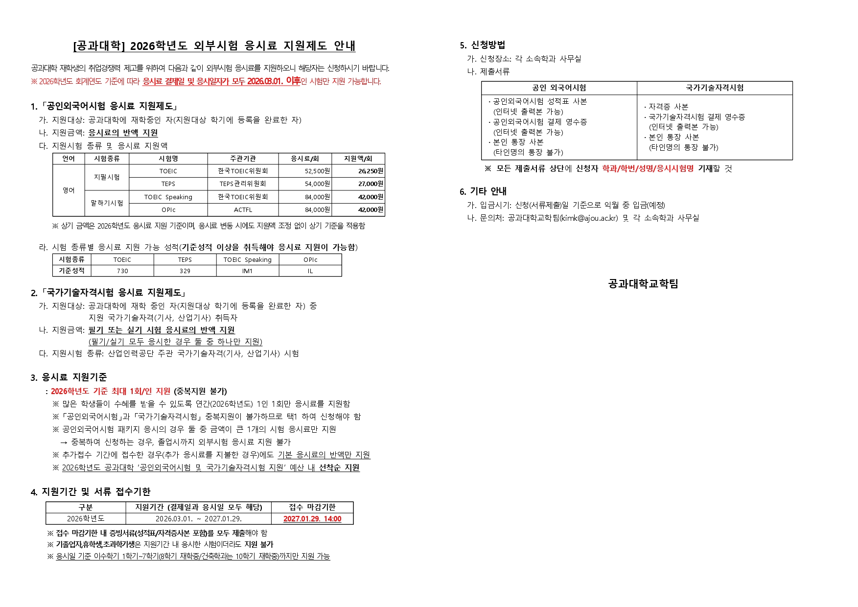 [공지] [공과대학] 2026학년도 외부시험 응시료 지원제도 안내