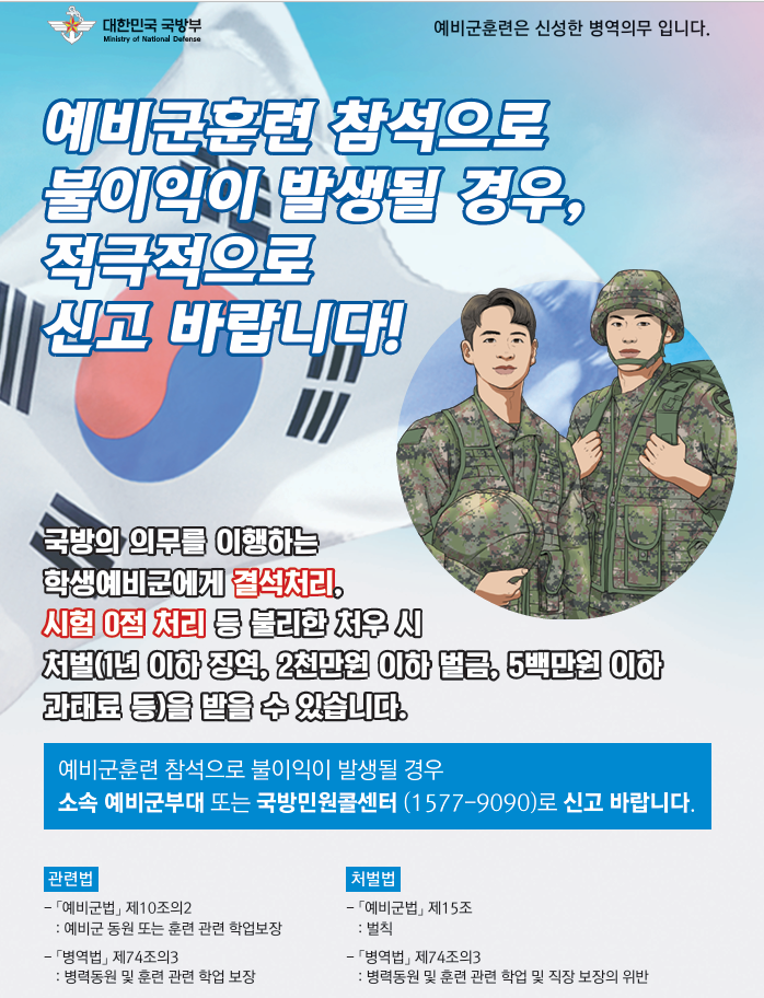 다. 이에 국방의무를 이행하는 학생예비군이 훈련 참가로 인해 학업 관련 불리한 처우를 받지 않도록 학교 차원의 관심과 세심한 주의를 당부드리며, 붙임의 포스터를 활용하여 관련규정 및 신고체계를 적극 홍보 바랍니다. [붙임#2]